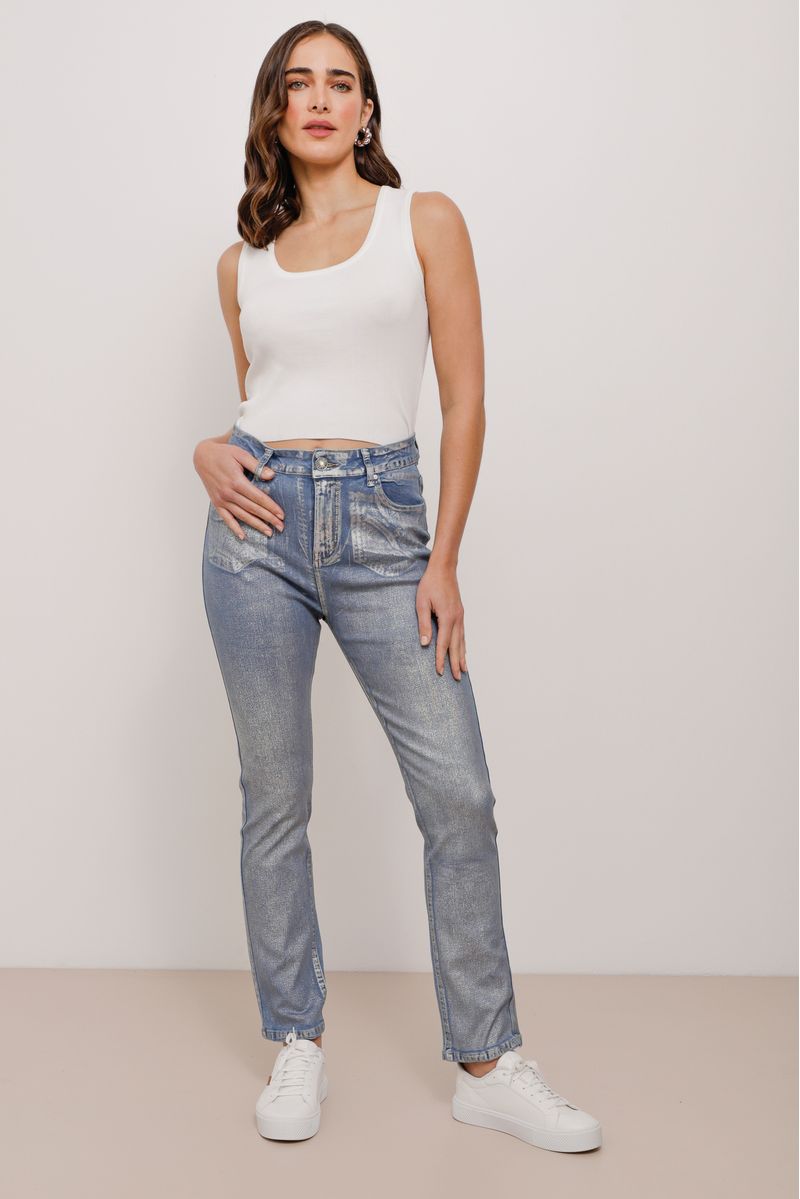 Calça jeans skinny, cintura alta com lycra. Textura foil metalizado. Bolsos frontais e posteriores, cós com passantes e fechamento por zíper e botão.