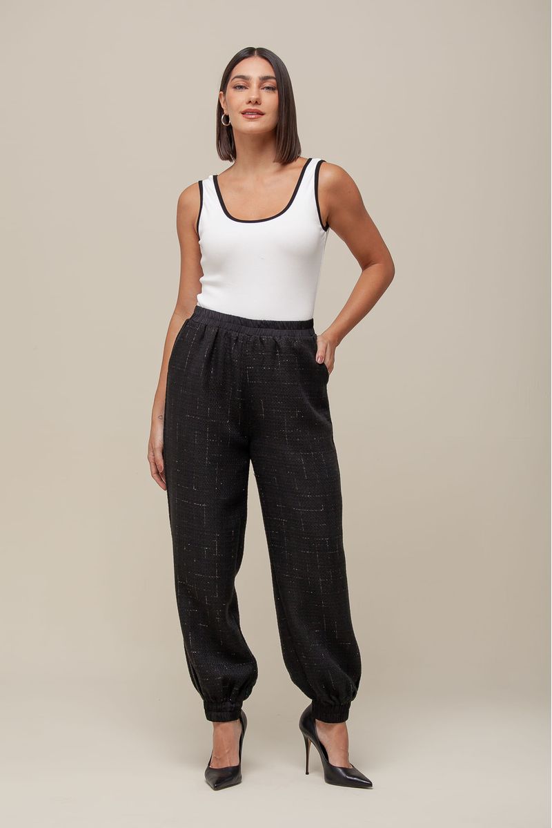 Calça jogger confeccionada em tweed com fios de lurex, que conferem um brilho discreto e sofisticado à peça. Possui forro interno para maior conforto, bolso faca funcional e elástico no cós e nas barras, garantindo um ajuste perfeito.