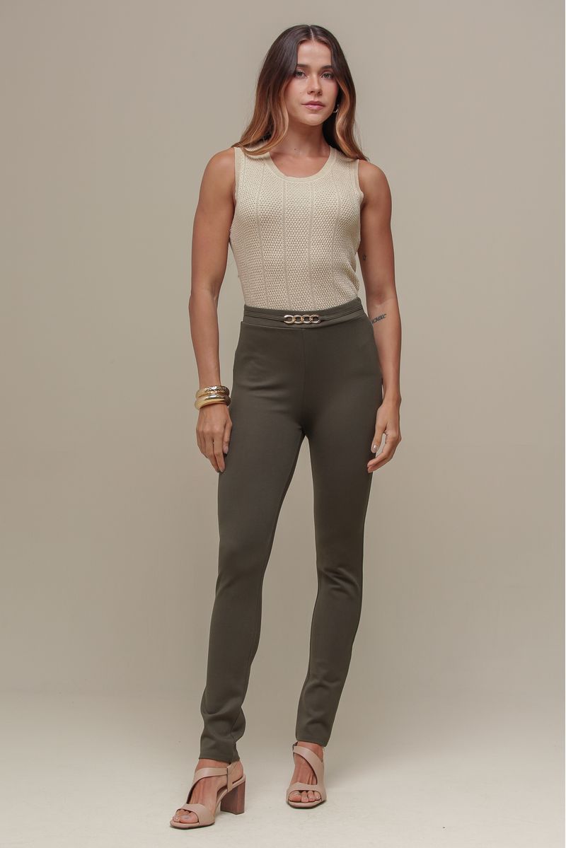 Calça montaria em tecido estruturado, modelagem justa, cintura alta com aplicação de corrente metálica frontal. Peça versátil e sofisticada, ideal para looks elegantes e modernos.