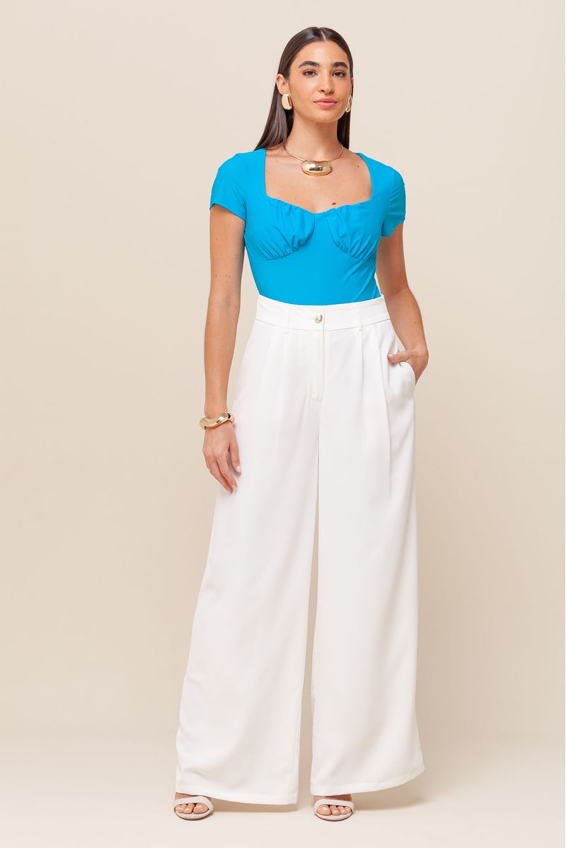 Calça pantalona em crepe leve, com pregas frontais que conferem um caimento impecável, bolso faca para praticidade e cintura alta para um toque de elegância. Forro interno acetinado, fechamento por zíper e botão.
