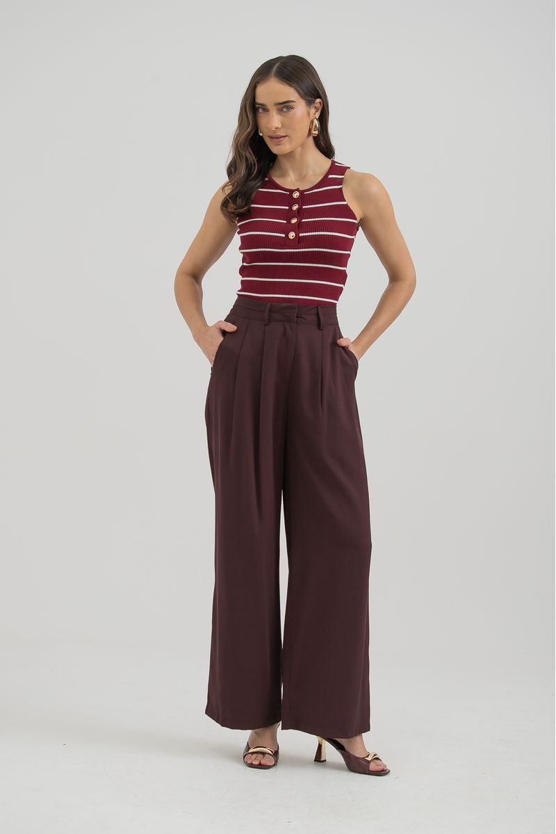 Calça em tecido plano com modelagem pantalona e caimento amplo. Possui pregas frontais que trazem sofisticação, cós com recorte que valoriza a cintura e bolsos funcionais. O fechamento por zíper, colchete e botão interno garante acabamento refinado, tornando a peça elegante e versátil para diferentes ocasiões.