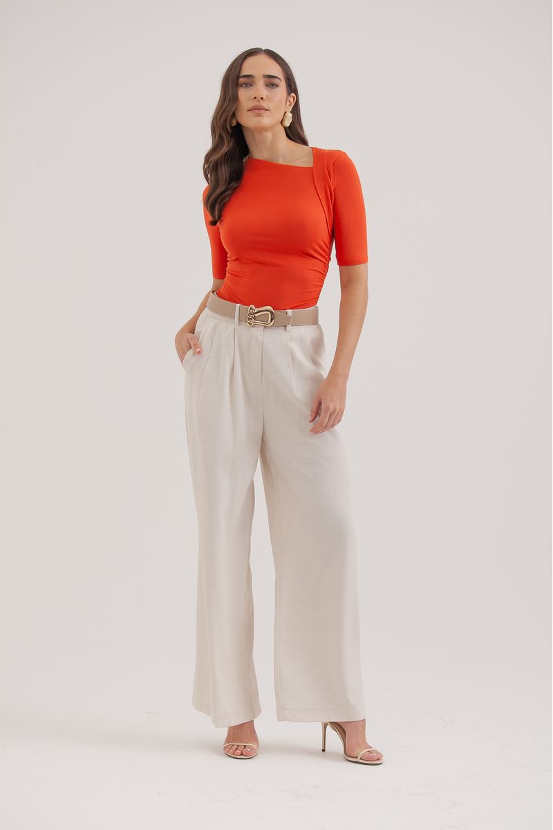 Calça Pantalona Pregas Frontais Cós Recorte AREIA