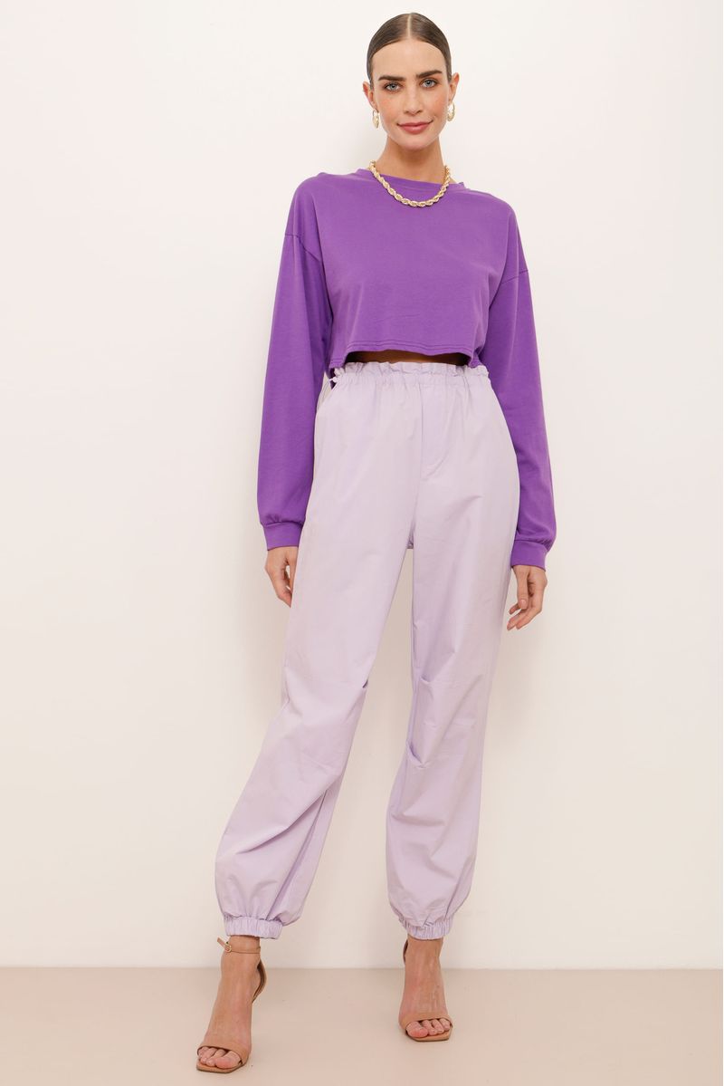 Calça modelo parachute, confeccionada em tactel. Cintura alta, elástico no cós com colchete ajustável. Bolso faca, elástico na barra e pregas frontais na região do joelho.