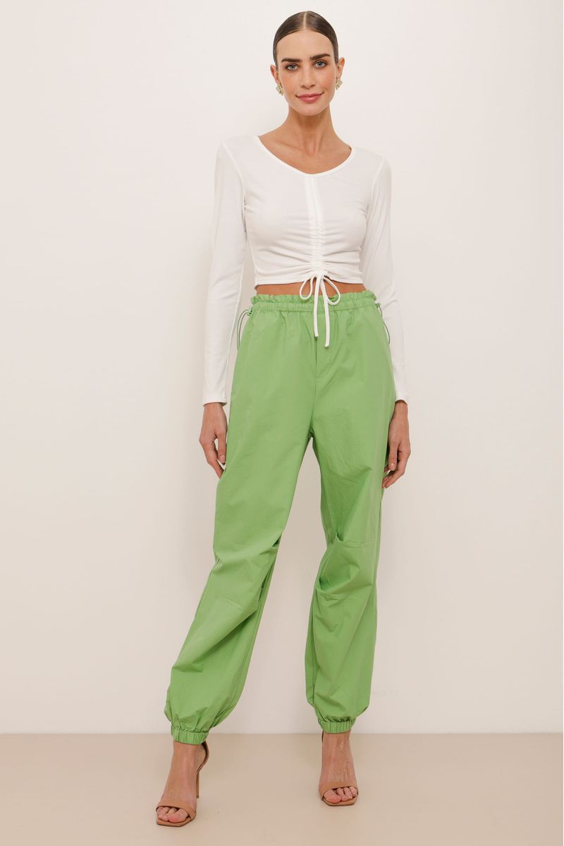 Calça modelo parachute, confeccionada em tactel. Cintura alta, elástico no cós com colchete ajustável. Bolso faca, elástico na barra e pregas frontais na região do joelho.