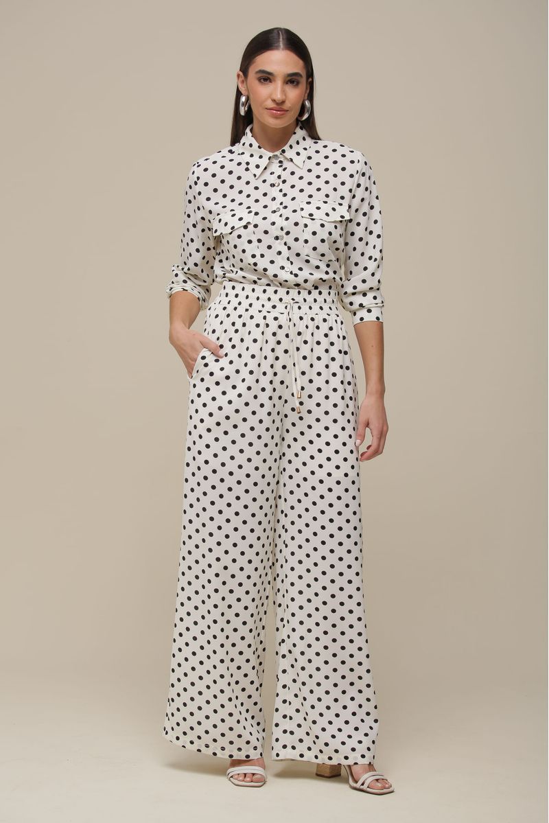 Calça pantalona em chiffon, com cintura alta e forro interno que proporciona conforto e fluidez ao movimento. O cós largo com elástico franzido e cordão para ajuste garante um encaixe perfeito, enquanto o bolso faca adiciona praticidade e estilo à peça. Com estampa poá delicada, essa calça traz um toque moderno e elegante, ideal para compor looks sofisticados e descomplicados.
