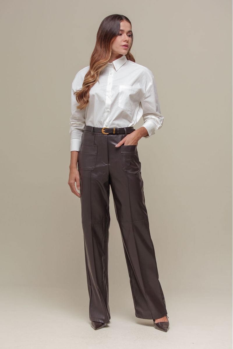 Calça reta em PU, com costuras aparentes, bolsos frontais e cintura alta. Possui fechamento por zíper e botão, além de acompanhar um cinto no mesmo material com fivela metálica. Uma peça versátil que traz sofisticação ao look.