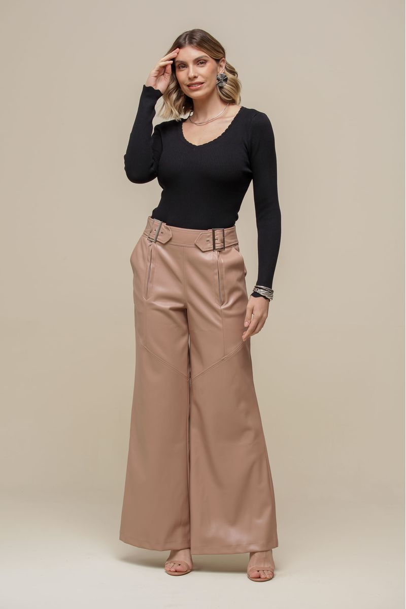 Calça pantalona confeccionada em PU, com cintura alta e fechamento por zíperes frontais com um acabamento impecável. O cós estruturado conta com cinto acoplado nas laterais, agregando sofisticação, enquanto os bolsos frontais trazem um toque funcional e elegante.