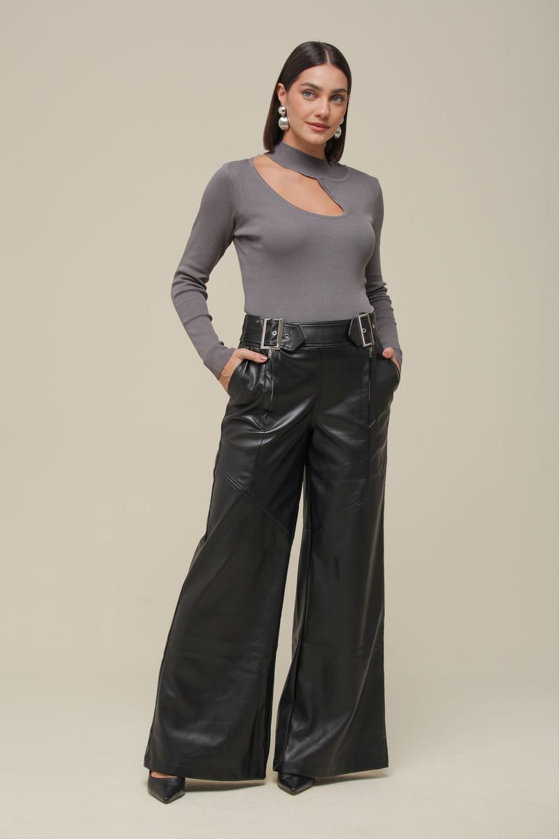 Calça pantalona confeccionada em PU, com cintura alta e fechamento por zíperes frontais com um acabamento impecável. O cós estruturado conta com cinto acoplado nas laterais, agregando sofisticação, enquanto os bolsos frontais trazem um toque funcional e elegante.