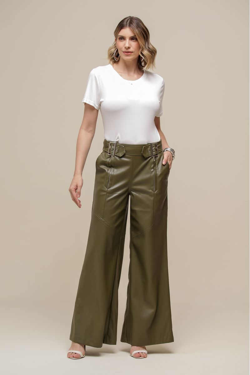 Calça pantalona confeccionada em PU, com cintura alta e fechamento por zíperes frontais com um acabamento impecável. O cós estruturado conta com cinto acoplado nas laterais, agregando sofisticação, enquanto os bolsos frontais trazem um toque funcional e elegante.