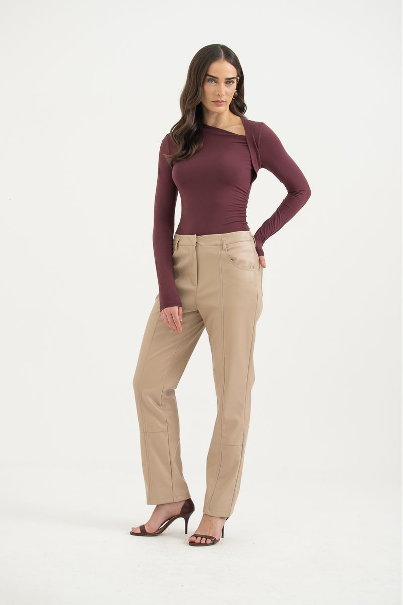 Calça em PU com recortes horizontais que trazem personalidade e sofisticação ao visual. A modelagem reta e a cintura média proporcionam caimento elegante, enquanto os bolsos frontais e traseiros completam o acabamento funcional.