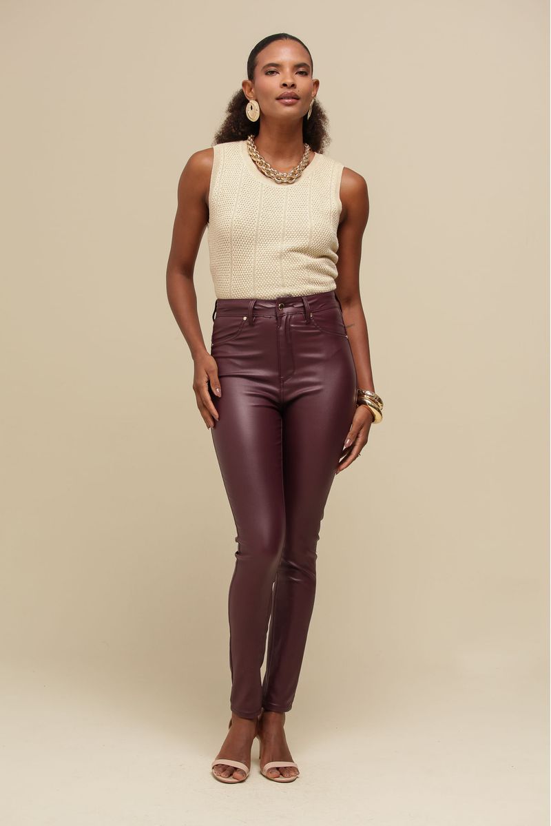 Calça skinny resinada, com leve elasticidade, modelagem justa e cintura alta. Possui bolsos traseiros, passantes para cinto e fechamento por zíper e botão.