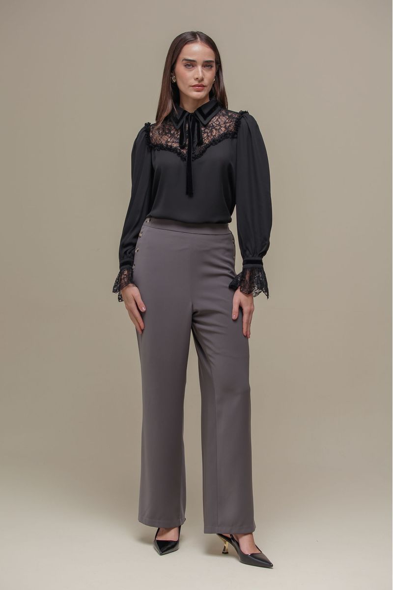 Combine com uma blusa de seda e salto alto para um look sofisticado e contemporâneo. A calça alfaiataria com botões é ideal para compor um visual profissional ou até mesmo para eventos mais formais.