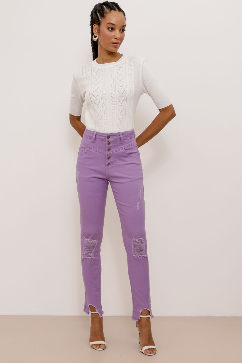 Calça skinny, em sarja com lycra. Cintura alta, com botões frontais dourados, bolsos frontais e posteriores. Possui puídos e destroyed nos joelhos, barras com recortes e desfiadas.