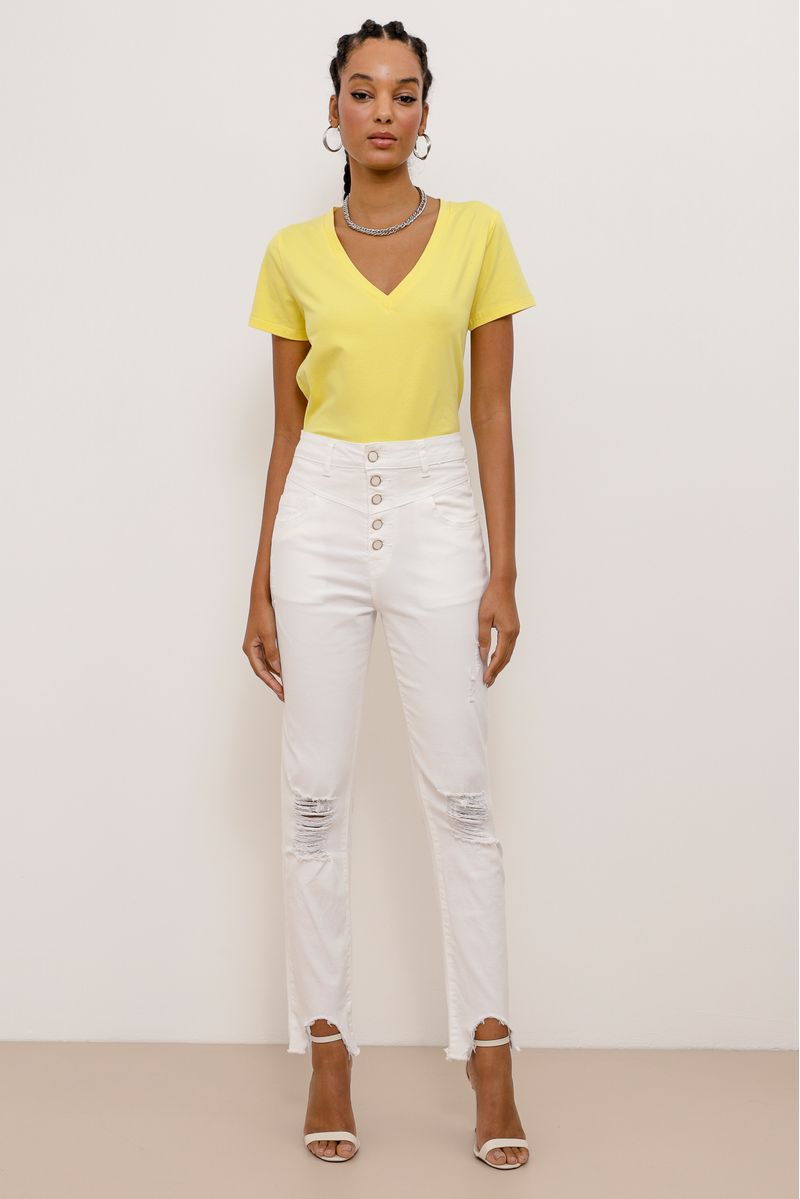 Calça skinny, em sarja com lycra. Cintura alta, com botões frontais dourados, bolsos frontais e posteriores. Possui puídos e destroyed nos joelhos, barras com recortes e desfiadas.