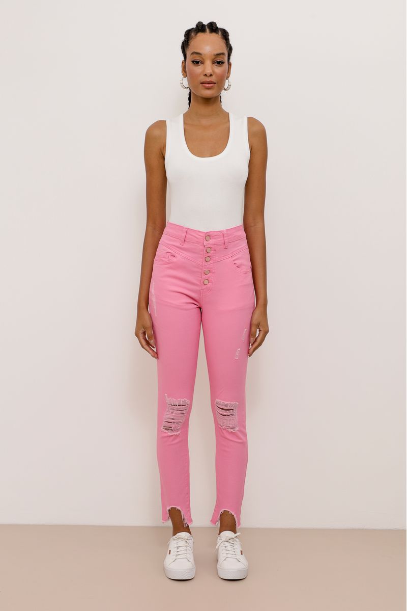 Calça skinny, em sarja com lycra. Cintura alta, com botões frontais dourados, bolsos frontais e posteriores. Possui puídos e destroyed nos joelhos, barras com recortes e desfiadas.