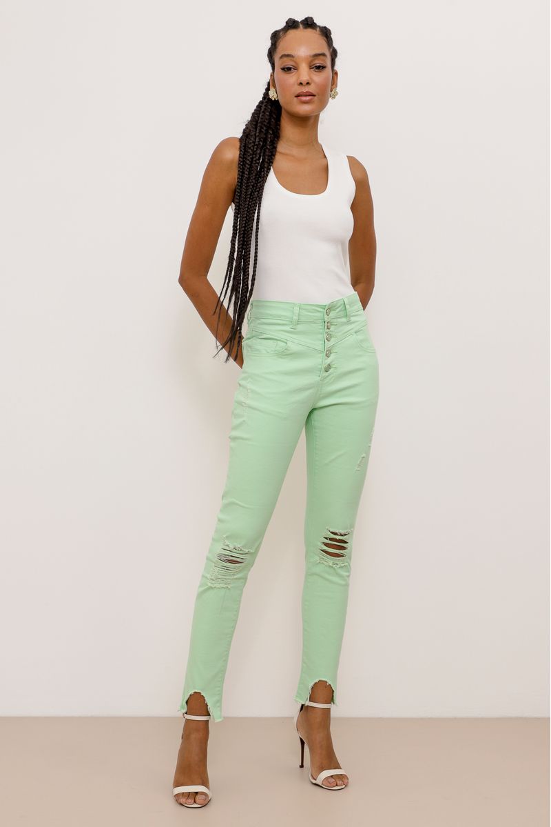 Calça skinny, em sarja com lycra. Cintura alta, com botões frontais dourados, bolsos frontais e posteriores. Possui puídos e destroyed nos joelhos, barras com recortes e desfiadas.