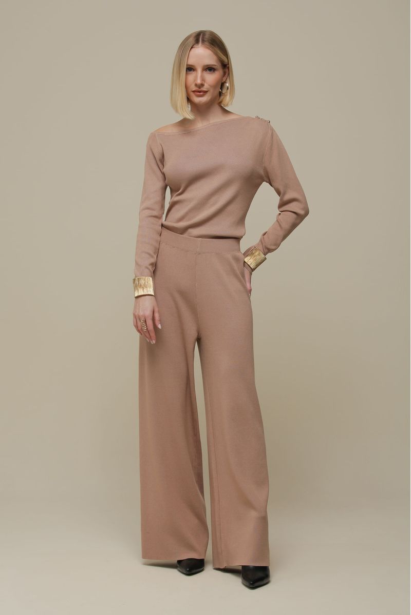Calça pantalona de tricô com cintura alta e cós elástico, proporcionando conforto e ajuste perfeito. O tecido de tricô confere leveza e suavidade, mantendo o estilo sem abrir mão do conforto.