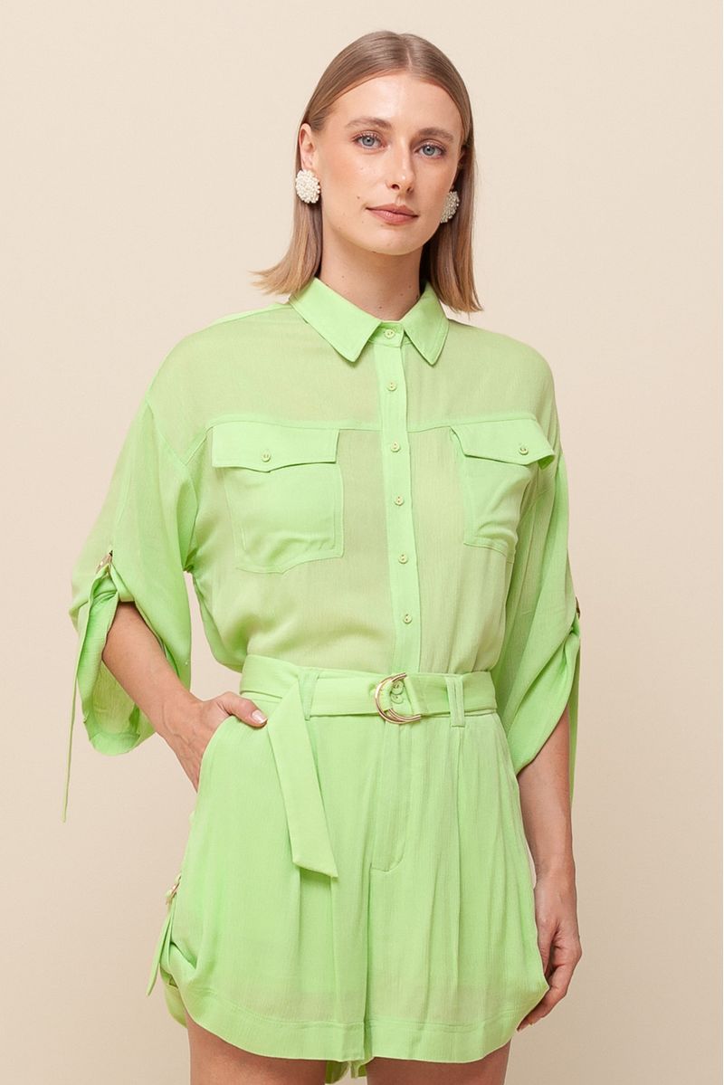 Camisa confeccionada em tecido anarruga, com mangas 3/4 e bolsos frontais que adicionam praticidade. Possui abotoamento frontal e delicados detalhes nos ombros que elevam o visual.