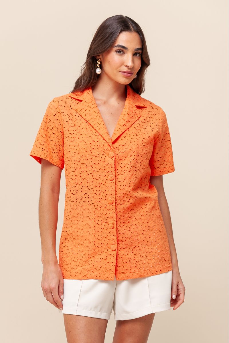 Camisa alongada em laise com trama vazada, ideal para sobreposições. Possui mangas curtas e fechamento frontal com botões forrados, conferindo um toque sofisticado e leve para dias mais frescos.