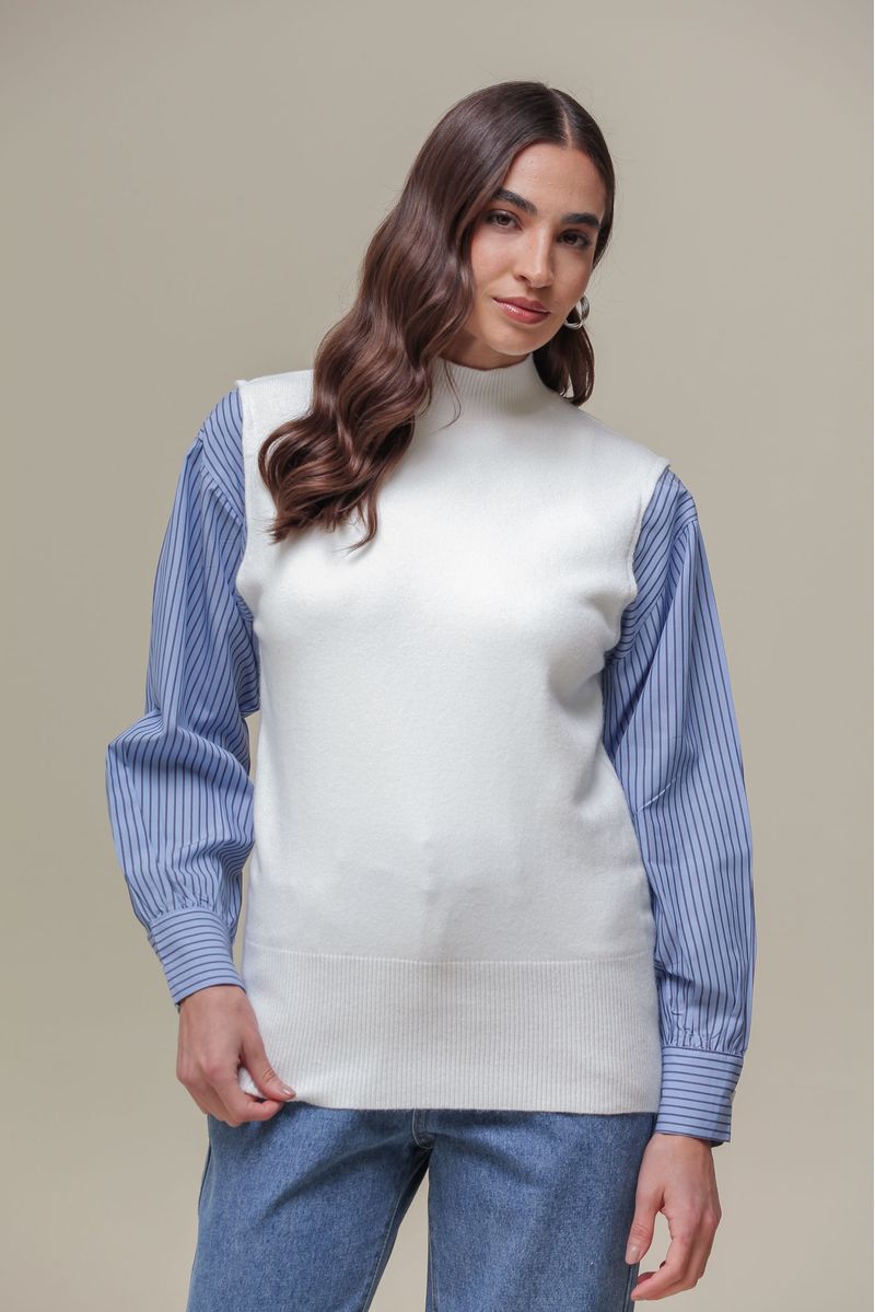 Camisa com corpo em tricô e mangas em tricoline. Possui gola alta, manga longa com punhos ajustáveis e fechamento por botão. A mistura de texturas traz sofisticação à peça, ideal para composições modernas.