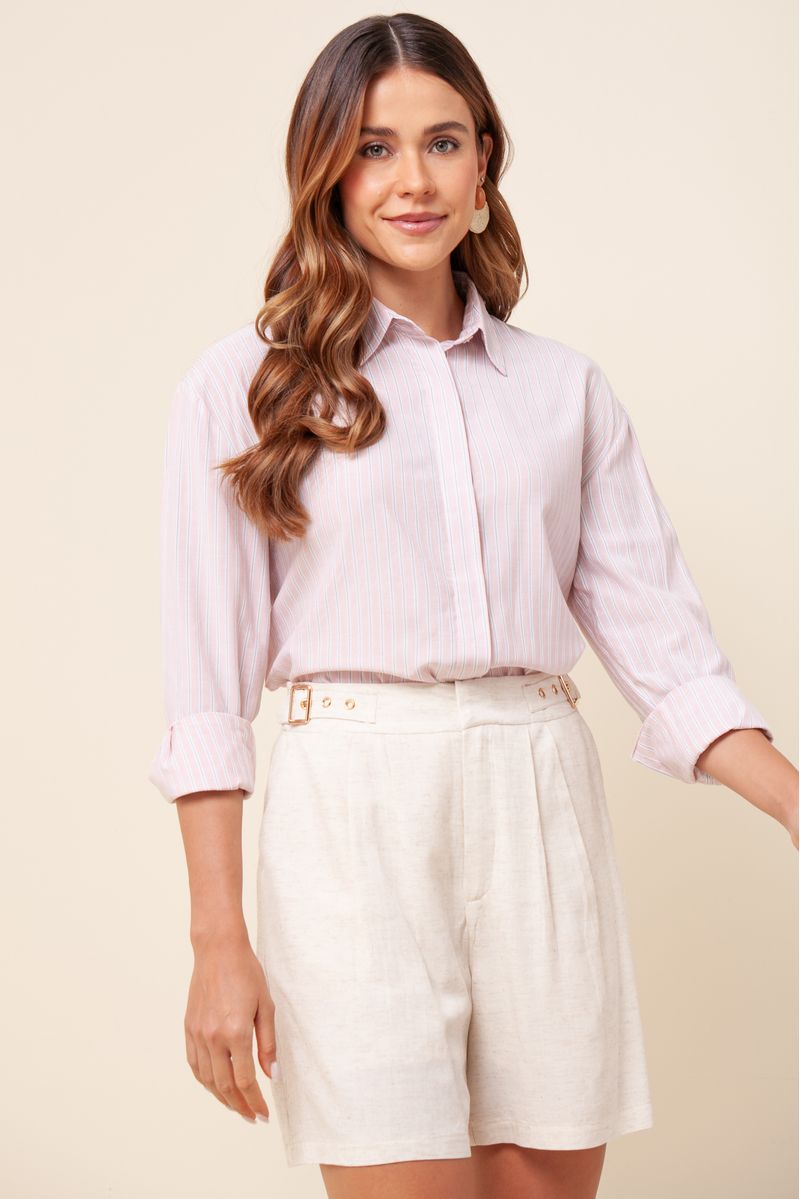 Camisa em tricoline, modelagem ampla listrada mullet abotoamento frontal invisível. Gola tradicional abortamento nos punhos.