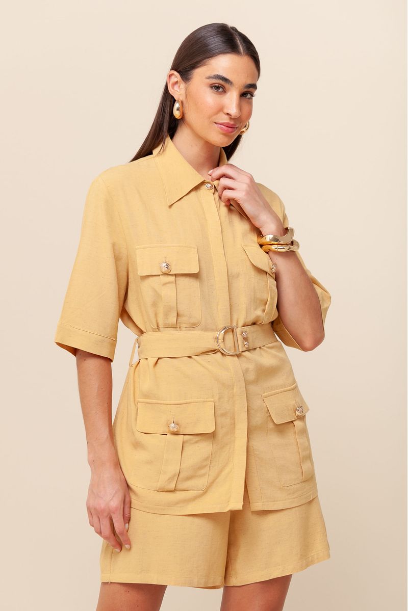 Camisa alongada em linho, com bolsos frontais de lapela e botão brasão que adicionam um toque sofisticado. Fechamento frontal com abotoamento invisível e mangas curtas para um visual clean e moderno. Acompanha faixa com fivela dourada para um ajuste acinturado.