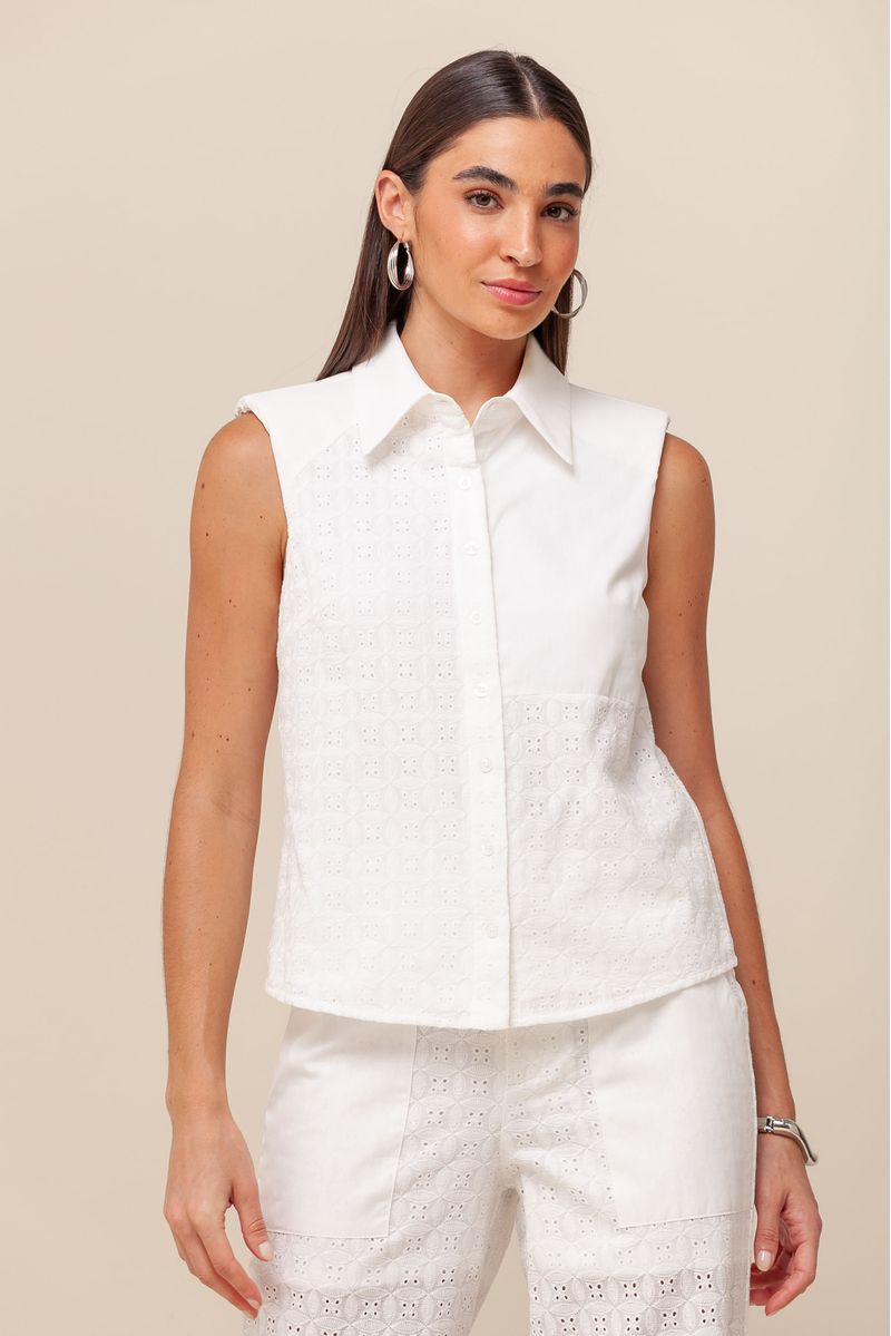 Camisa em laise com alças largas e ombreira, adicionando estrutura e elegância. Possui abotoamento frontal e gola em tricoline, que traz um contraste sutil de textura e sofisticação.