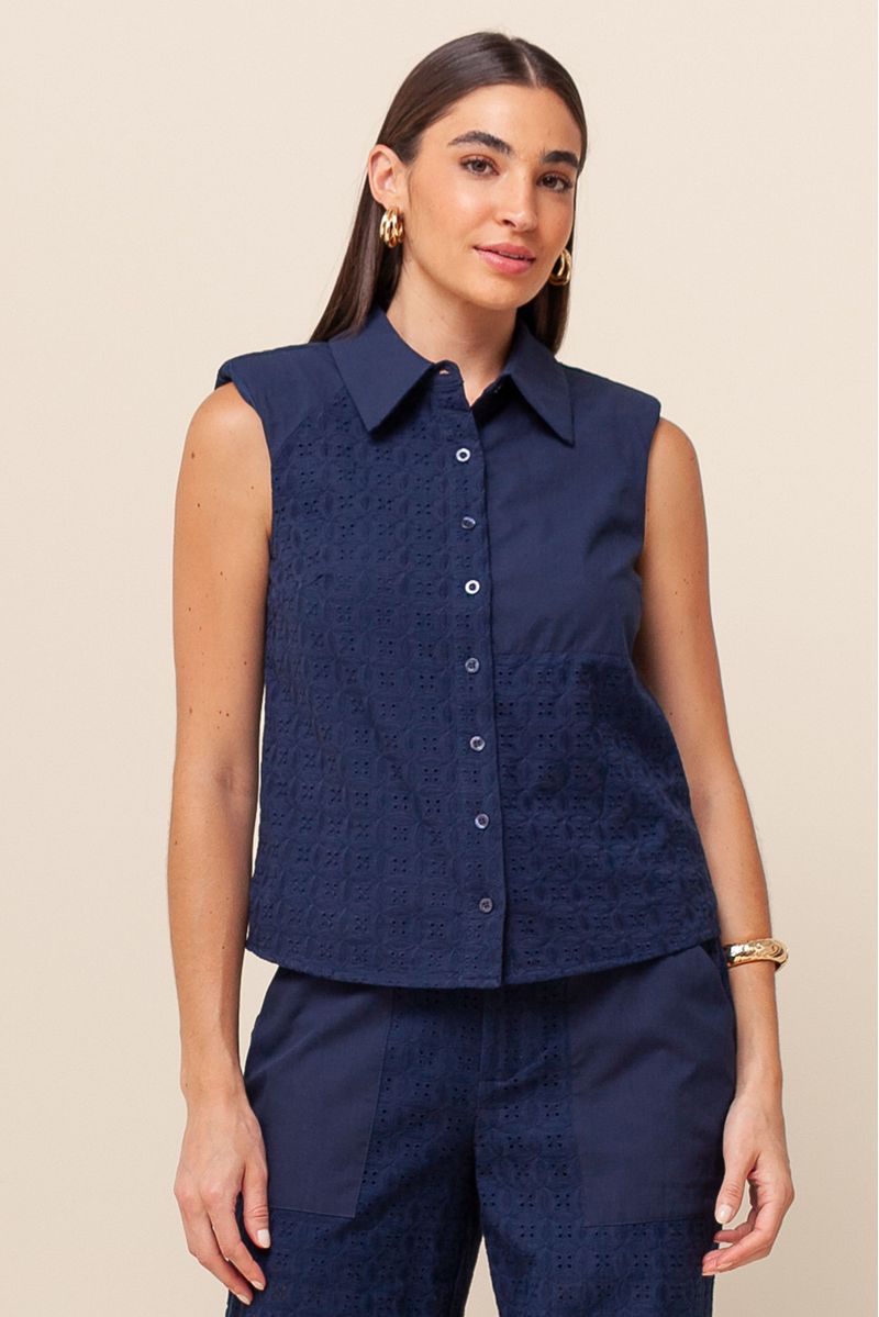 Camisa em laise com alças largas e ombreira, adicionando estrutura e elegância. Possui abotoamento frontal e gola em tricoline, que traz um contraste sutil de textura e sofisticação.