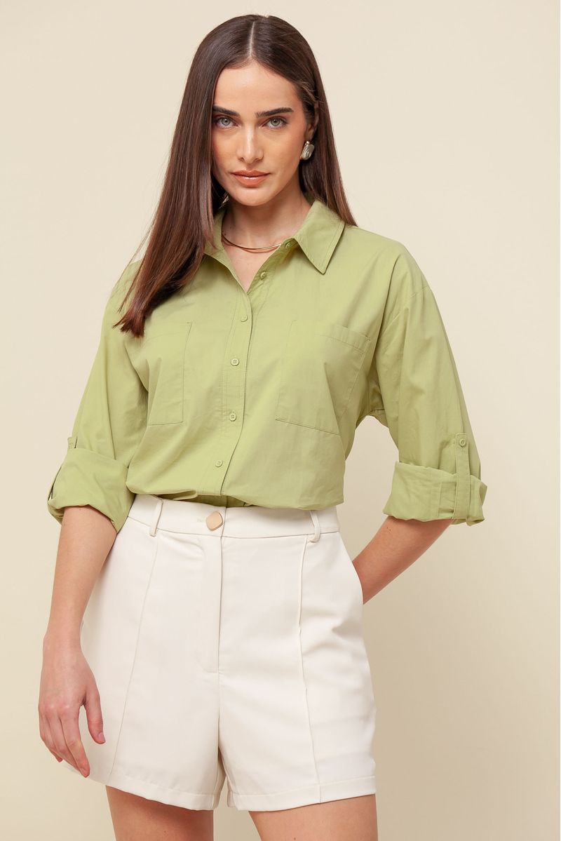 Camisa ampla em tricoline, com abotoamento frontal, bolsos utilitários e manga longa. O botão nas mangas oferece a opção de usá-las 3/4, proporcionando versatilidade ao look.