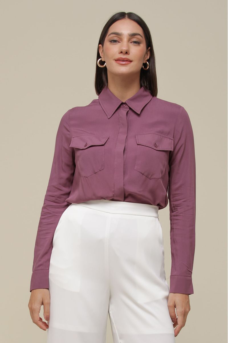 Camisa social em viscose, com modelagem clássica, manga longa e abotoamento frontal invisível. Os bolsos frontais com lapela e botão adicionam um toque funcional, enquanto a gola tradicional garante elegância atemporal.