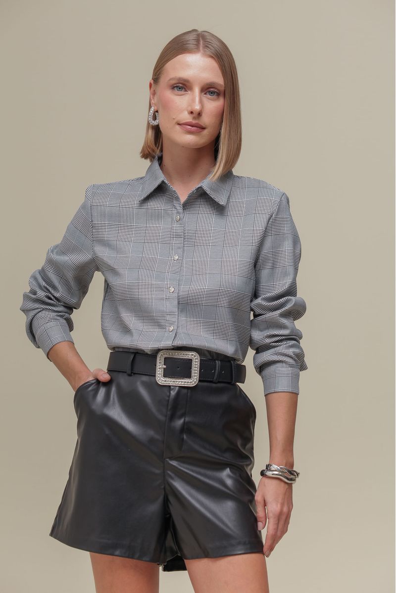 Camisa de tweed xadrez com abotoamento frontal, manga longa e gola tradicional, perfeita para criar looks estilosos e com um toque clássico.