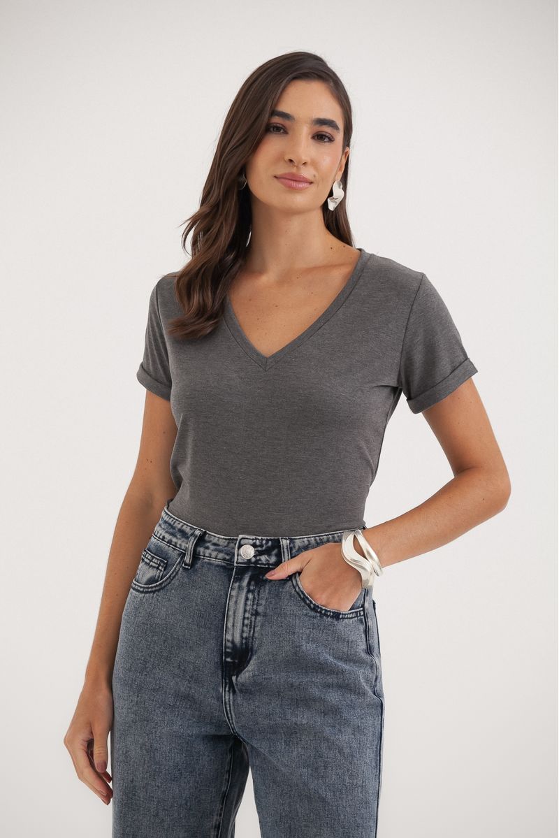 Camiseta confeccionada em malha com toque macio e confortável, desenvolvida com modelagem ajustada ao corpo que valoriza a silhueta de forma sutil. Possui decote V que alonga o colo, mangas curtas e barra reta, garantindo versatilidade e acabamento clean. Uma peça essencial e sofisticada para composições modernas, do casual ao urbano refinado.