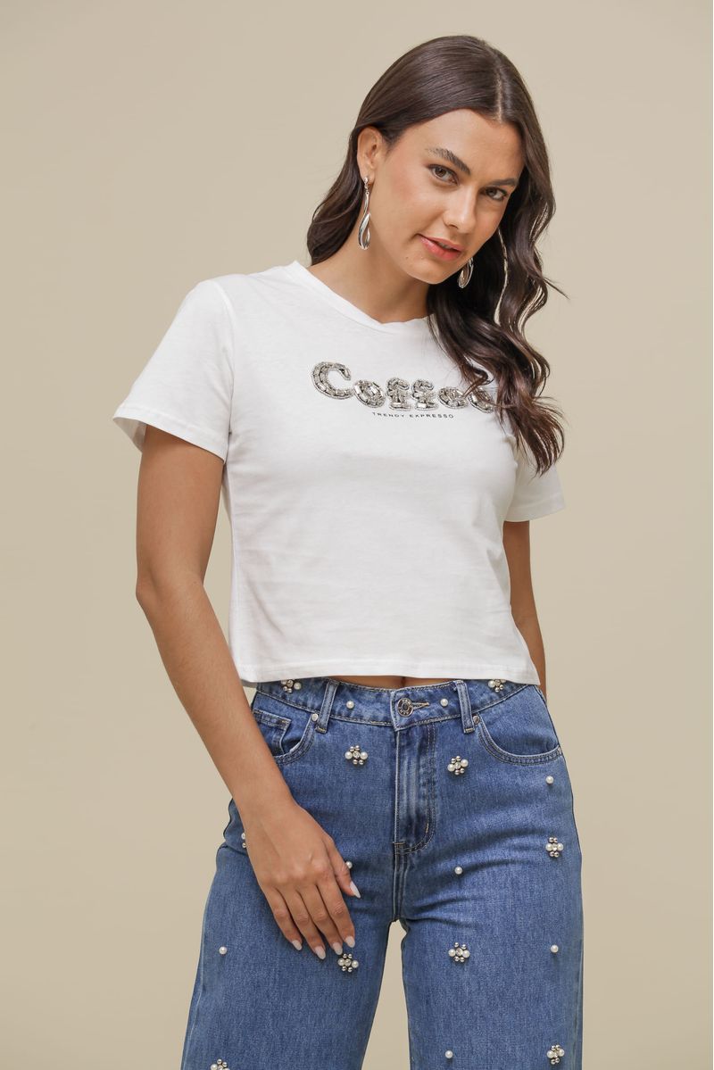 Camiseta em malha fria, modelagem justa e curta, com gola careca e manga curta. O bordado em pedras forma a frase "Coffee Trendy Expresso", trazendo um toque especial à peça.