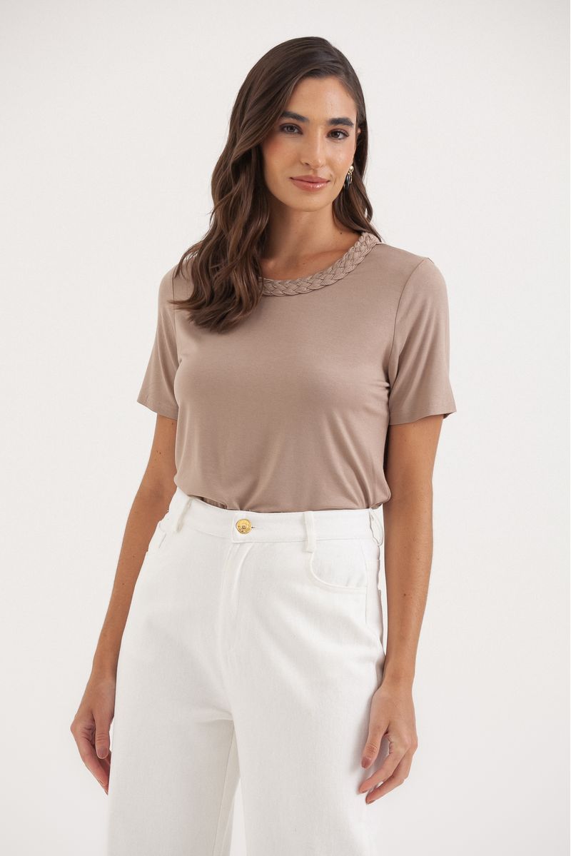 Camiseta confeccionada em malha de viscose, com toque macio e caimento leve. Possui modelagem reta e comprimento médio, proporcionando conforto e versatilidade no uso. O destaque fica por conta do detalhe trançado no decote redondo, que adiciona personalidade e um toque moderno à peça. Ideal para composições elegantes e descomplicadas no dia a dia.