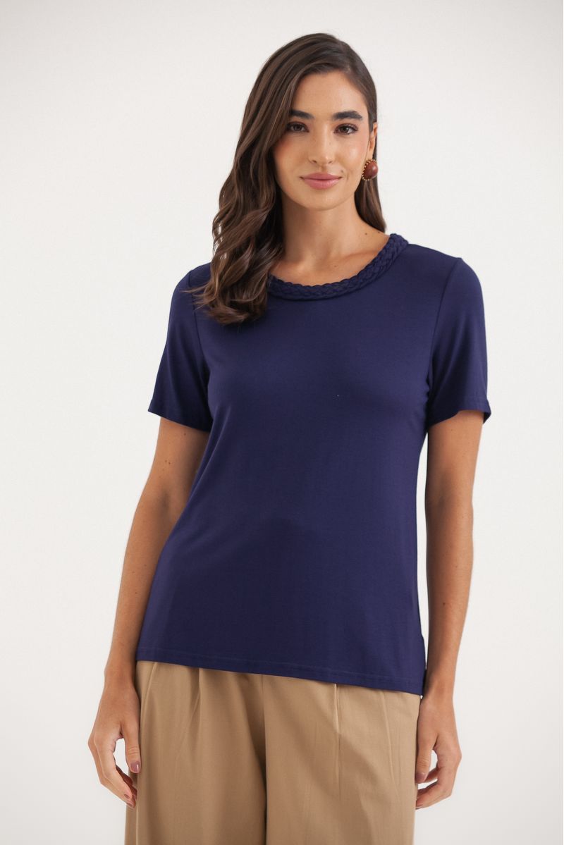 Camiseta confeccionada em malha de viscose, com toque macio e caimento leve. Possui modelagem reta e comprimento médio, proporcionando conforto e versatilidade no uso. O destaque fica por conta do detalhe trançado no decote redondo, que adiciona personalidade e um toque moderno à peça. Ideal para composições elegantes e descomplicadas no dia a dia.