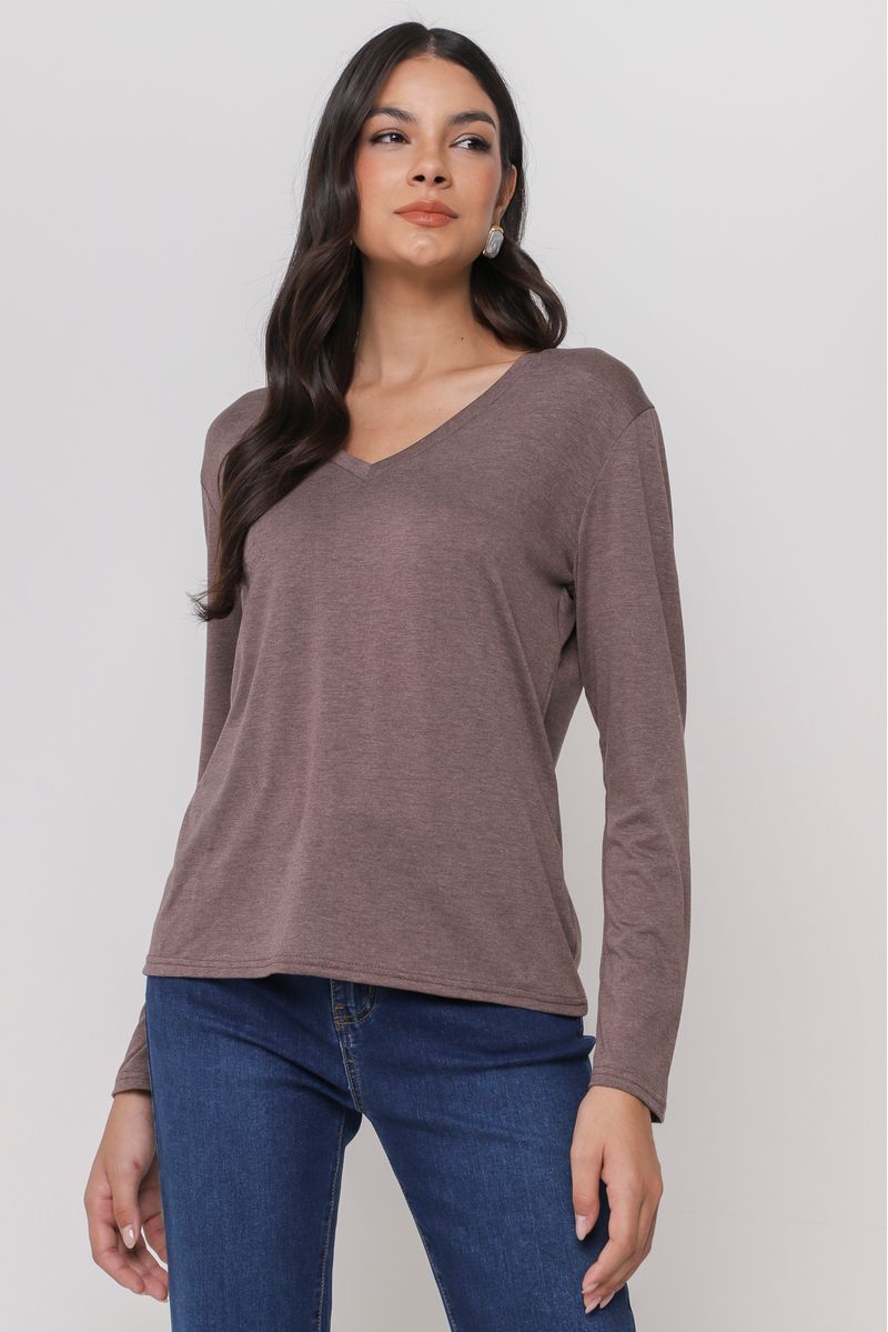 Blusa confeccionada em malha com elastano, oferecendo leveza e maleabilidade. Com mangas longas e decote em V, é perfeita para looks confortáveis e versáteis.