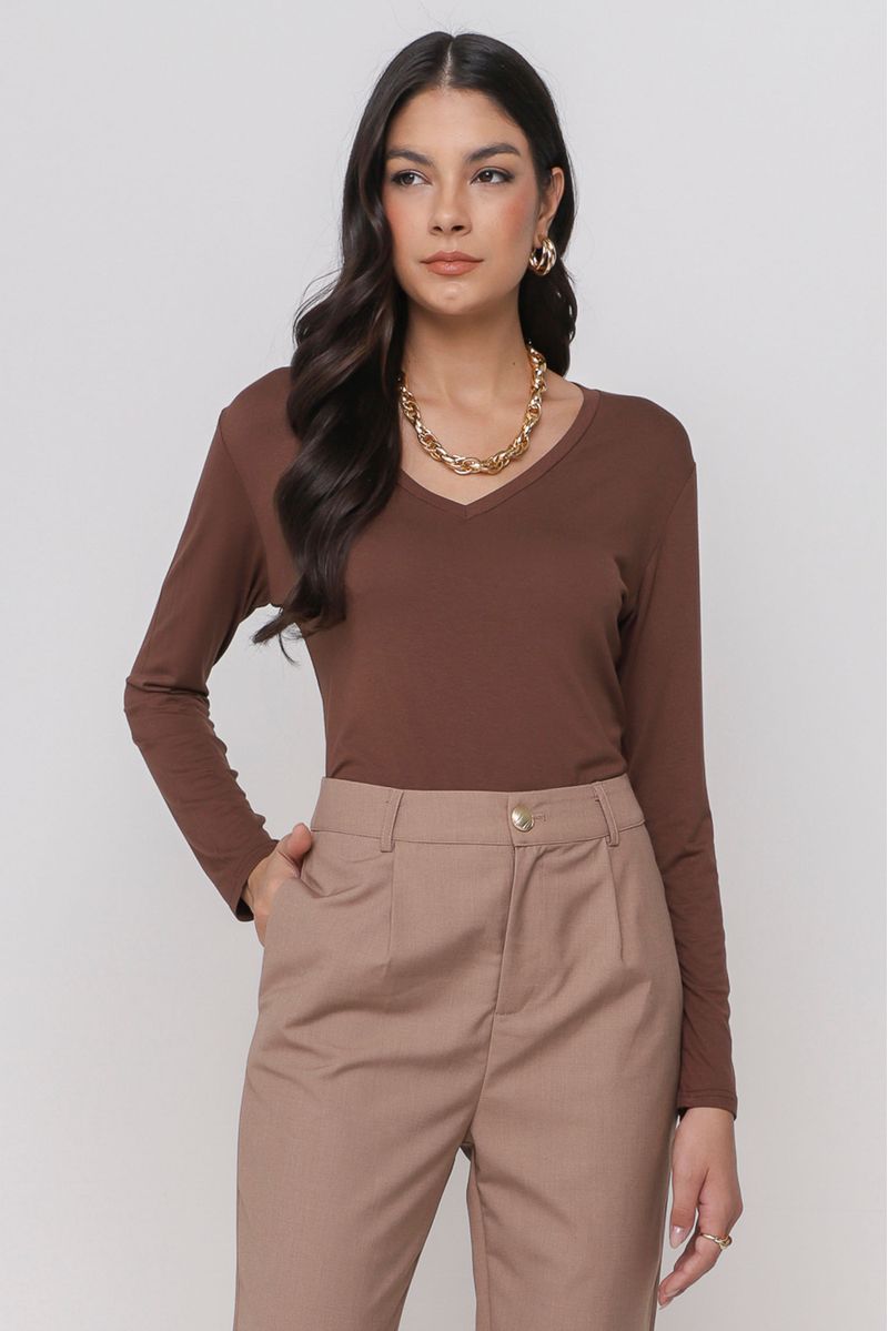 Blusa confeccionada em malha com elastano, oferecendo leveza e maleabilidade. Com mangas longas e decote em V, é perfeita para looks confortáveis e versáteis.
