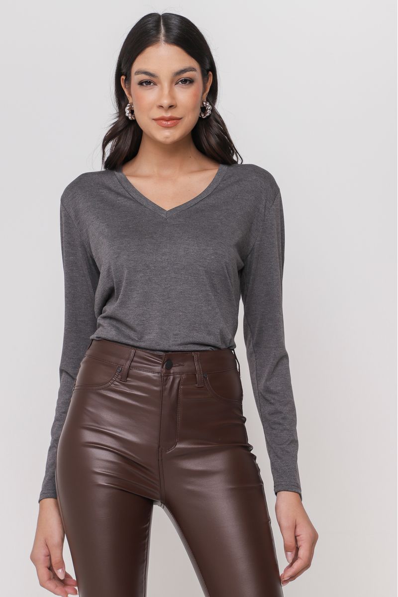 Blusa confeccionada em malha com elastano, oferecendo leveza e maleabilidade. Com mangas longas e decote em V, é perfeita para looks confortáveis e versáteis.
