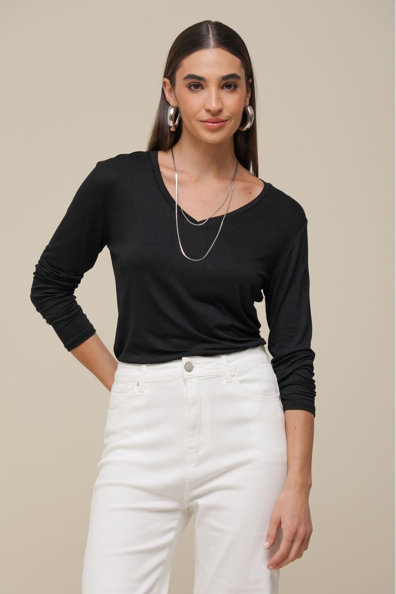Camiseta Decote V Manga Longa Caixinha PRETO