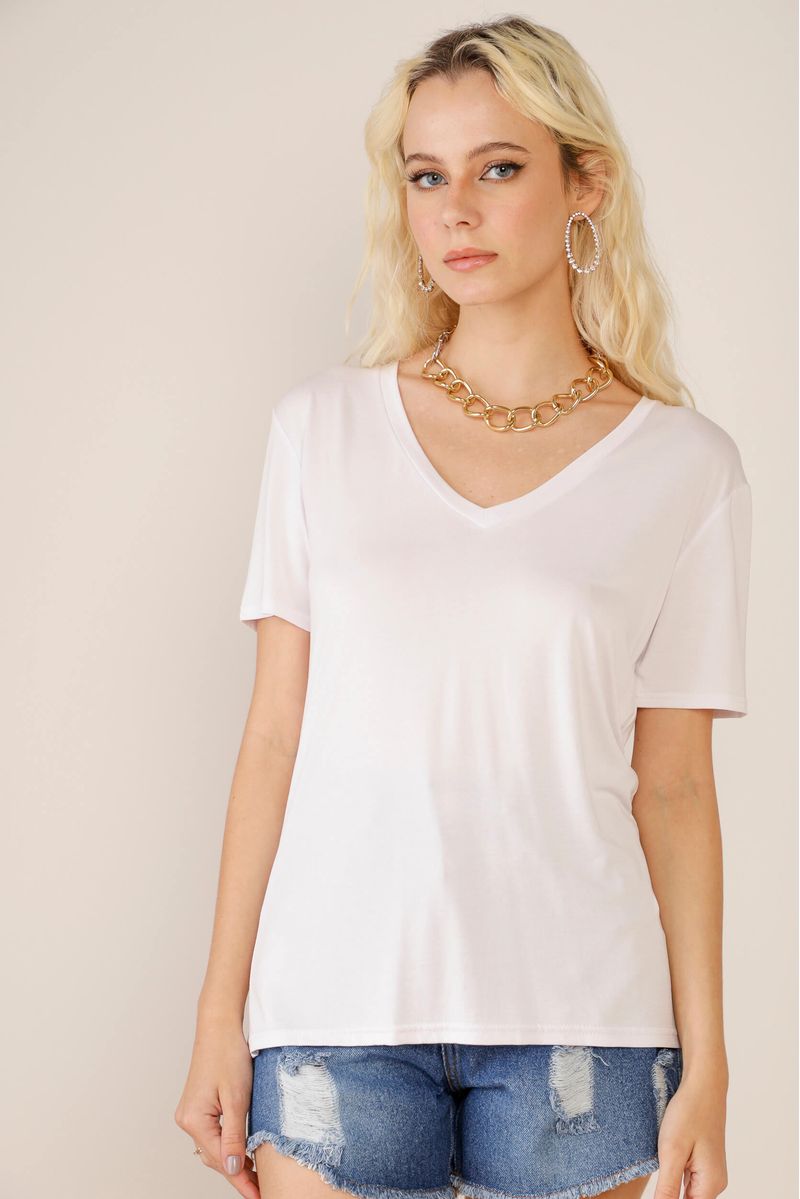 Camiseta confeccionada em malha, decote v e mangas curtas.