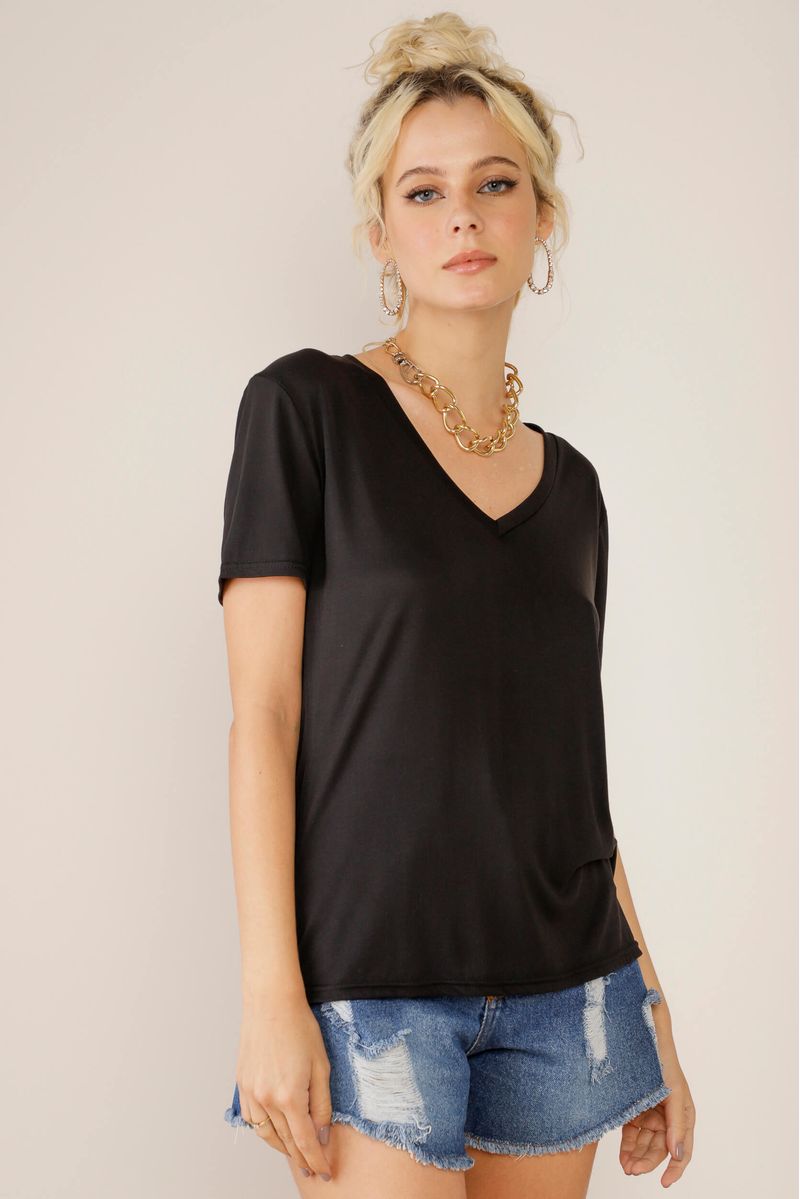 Camiseta confeccionada em malha, decote v e mangas curtas.