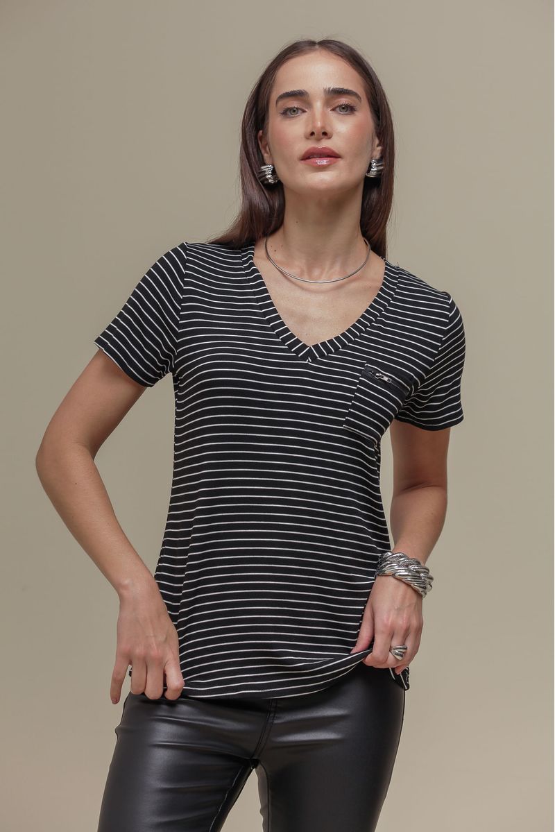 Camiseta de malha leve e macia, com listras horizontais que trazem um toque descontraído. Manga curta e gola V, com bolsinho frontal adornado por zíper, que adiciona um detalhe moderno à peça. Modelagem ampla, oferecendo conforto e estilo.
