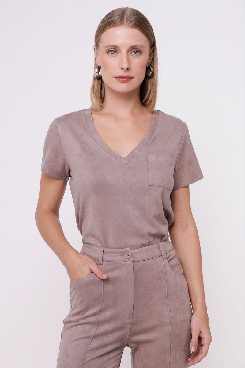 Camiseta em Suede com gola em V, manga curta e bolso frontal. Tecido leve e toque macio.