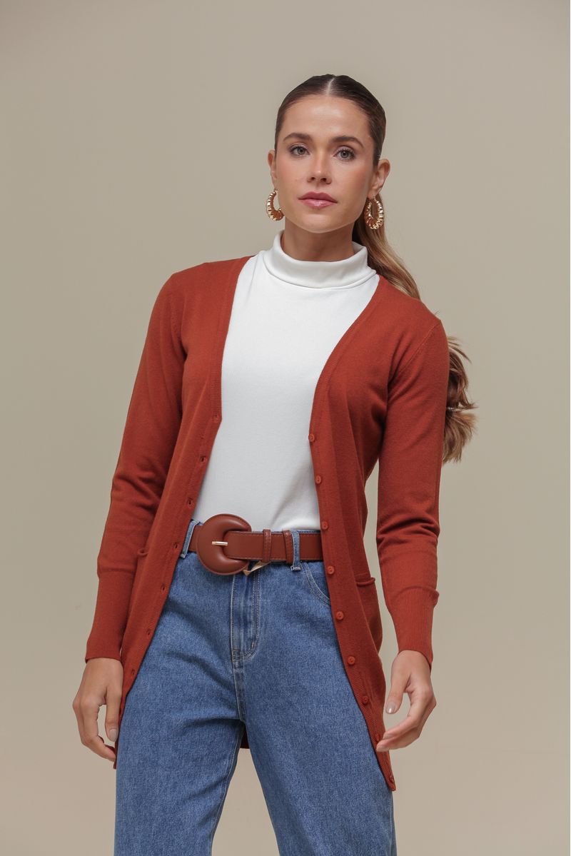 Cardigan alongado e leve, confeccionado em tricô, ideal para compor looks versáteis no dia a dia. Possui gola V, abotoamento frontal e bolsos frontais, agregando praticidade e estilo. As mangas longas ajustadas nos punhos e a barra proporcionam um caimento elegante e confortável.
