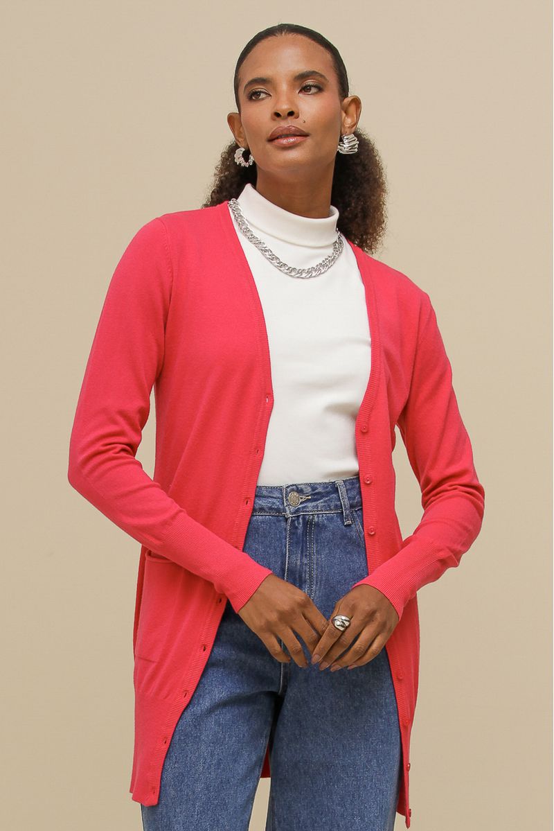 Cardigan alongado e leve, confeccionado em tricô, ideal para compor looks versáteis no dia a dia. Possui gola V, abotoamento frontal e bolsos frontais, agregando praticidade e estilo. As mangas longas ajustadas nos punhos e a barra proporcionam um caimento elegante e confortável.