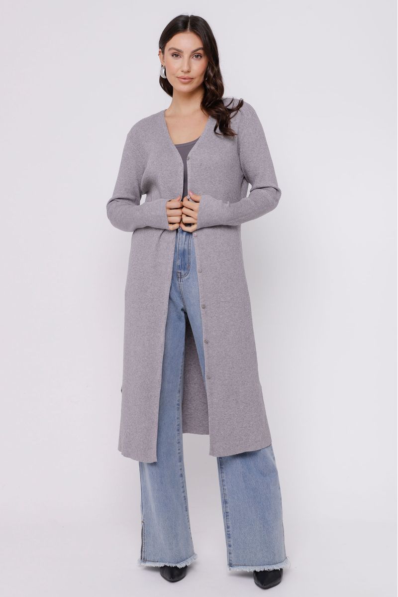 Cardigan longo confeccionado em tricot, oferecendo muito conforto. Apresenta abotoamento frontal. A gola em V adiciona um toque de sofisticação ao visual. Ideal para diversas ocasiões, este cardigan é uma peça versátil e elegante para o seu guarda-roupa.