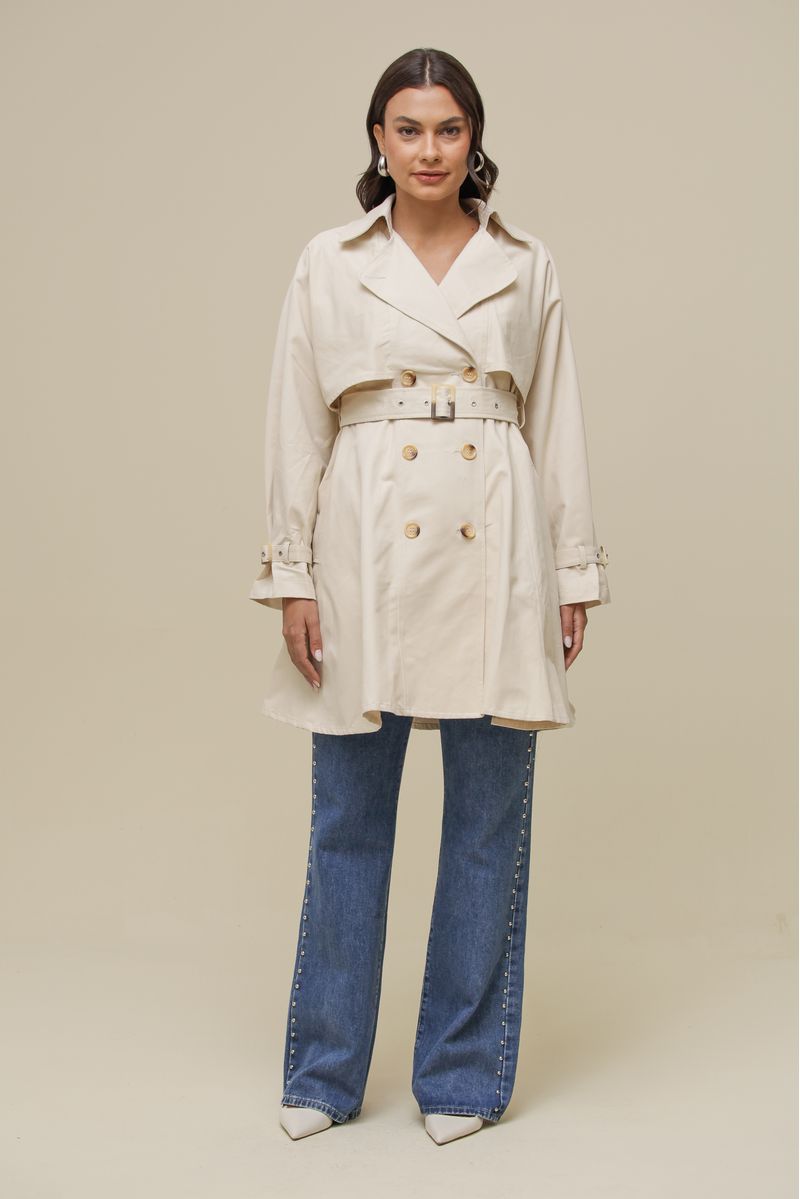Casaco trench coat confeccionado em tecido sarjado, com modelagem ampla e caimento estruturado. Possui parte superior sobreposta fixa e recortes abaixo das axilas para melhor ajuste. O forro acetinado está presente apenas no tronco, proporcionando conforto. A parte inferior franzida adiciona um efeito sutil de saia, trazendo sofisticação ao design. Conta com fechamento transpassado por botões, bolsos frontais funcionais e mangas longas com ajuste nos punhos. Acompanha faixa com fivela para ajuste na cintura.