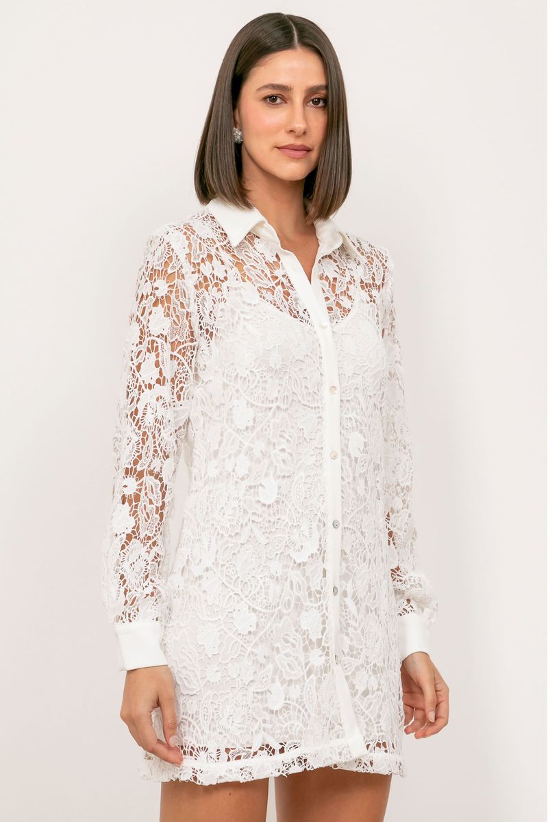 Chemise alongada, confeccionada em Guipure. Manga longa, abotoamento frontal e nos punhos. Gola tradicional confeccionada em crepe, forro interno com alça fina confeccionada em poliéster.