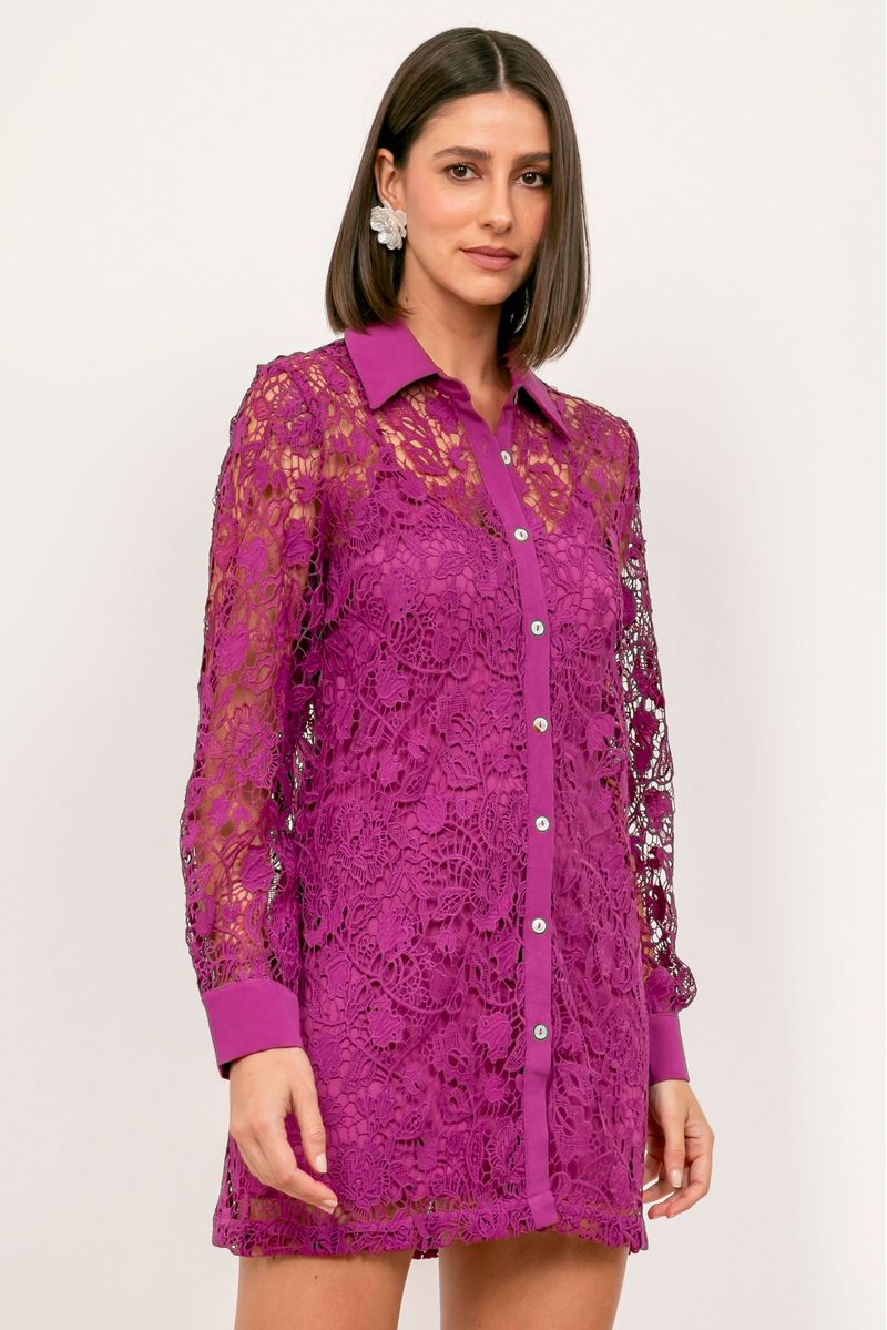 Chemise alongada, confeccionada em Guipure. Manga longa, abotoamento frontal e nos punhos. Gola tradicional confeccionada em crepe, forro interno com alça fina confeccionada em poliéster.