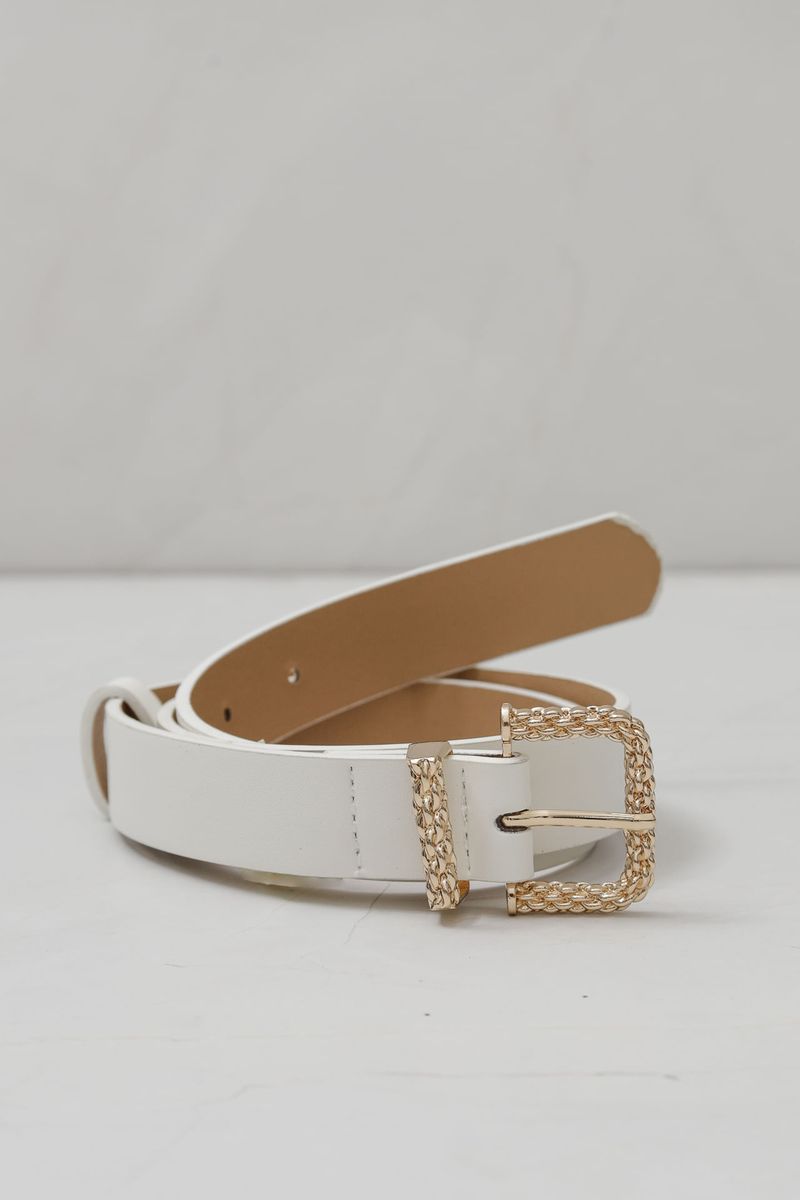 Cinto fino confeccionado em PU, modelo de cintura baixa, com fivela metalizada trançada. Um acessório delicado e elegante que adiciona um toque de sofisticação ao visual.